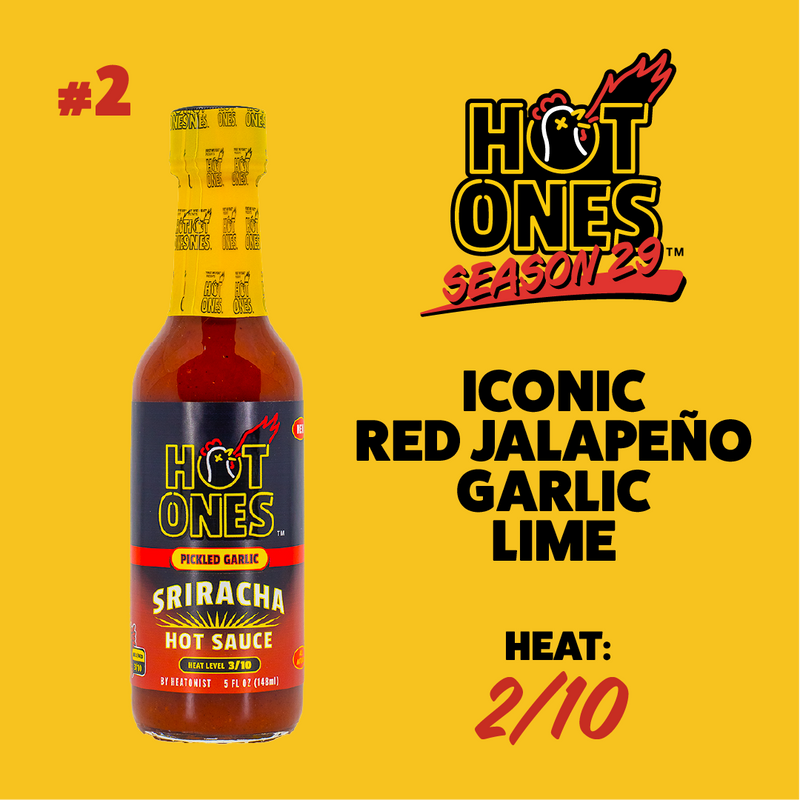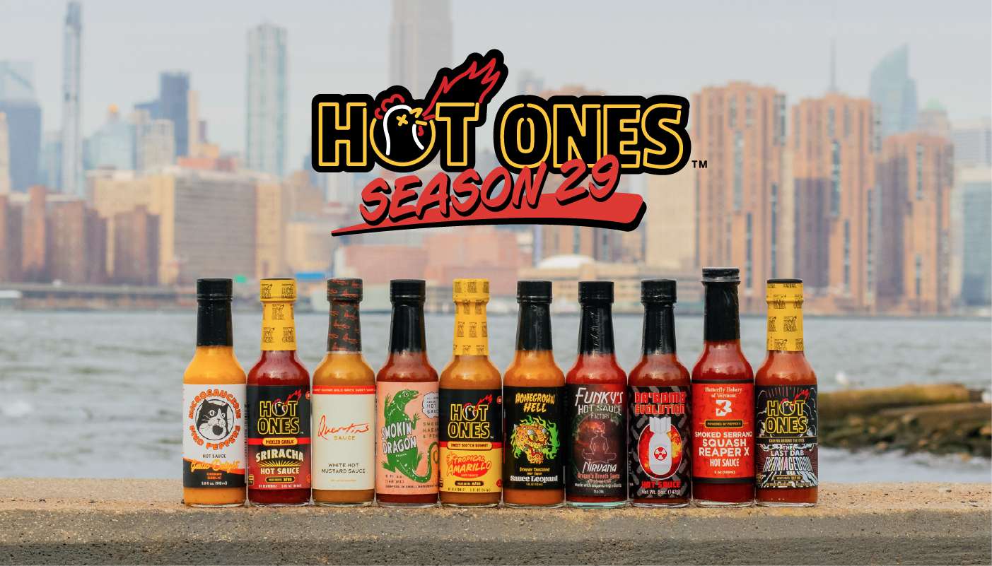 Get the full Hot Ones hot sauce lineup in one custom box with 10 sauces, heat guide and stickers.