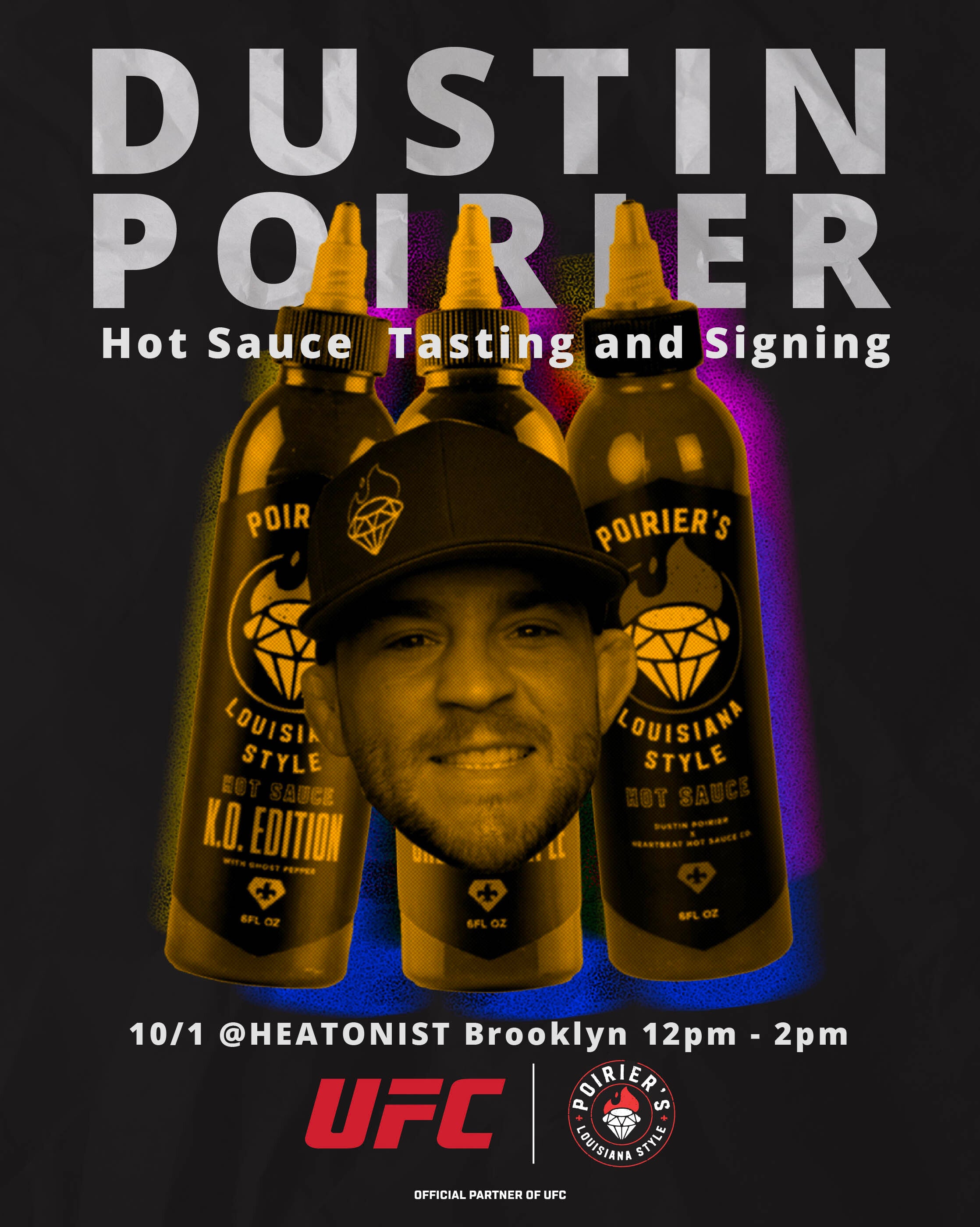 Can't make it to Hot Sauce Expo on Saturday? Meet The Diamond at HEATONIST! Join us at our Brooklyn hot sauce shop from 12-2 PM this Sunday, October 1st, to get your Poirier's Louisiana Style hot sauce signed by Dustin Poirier!