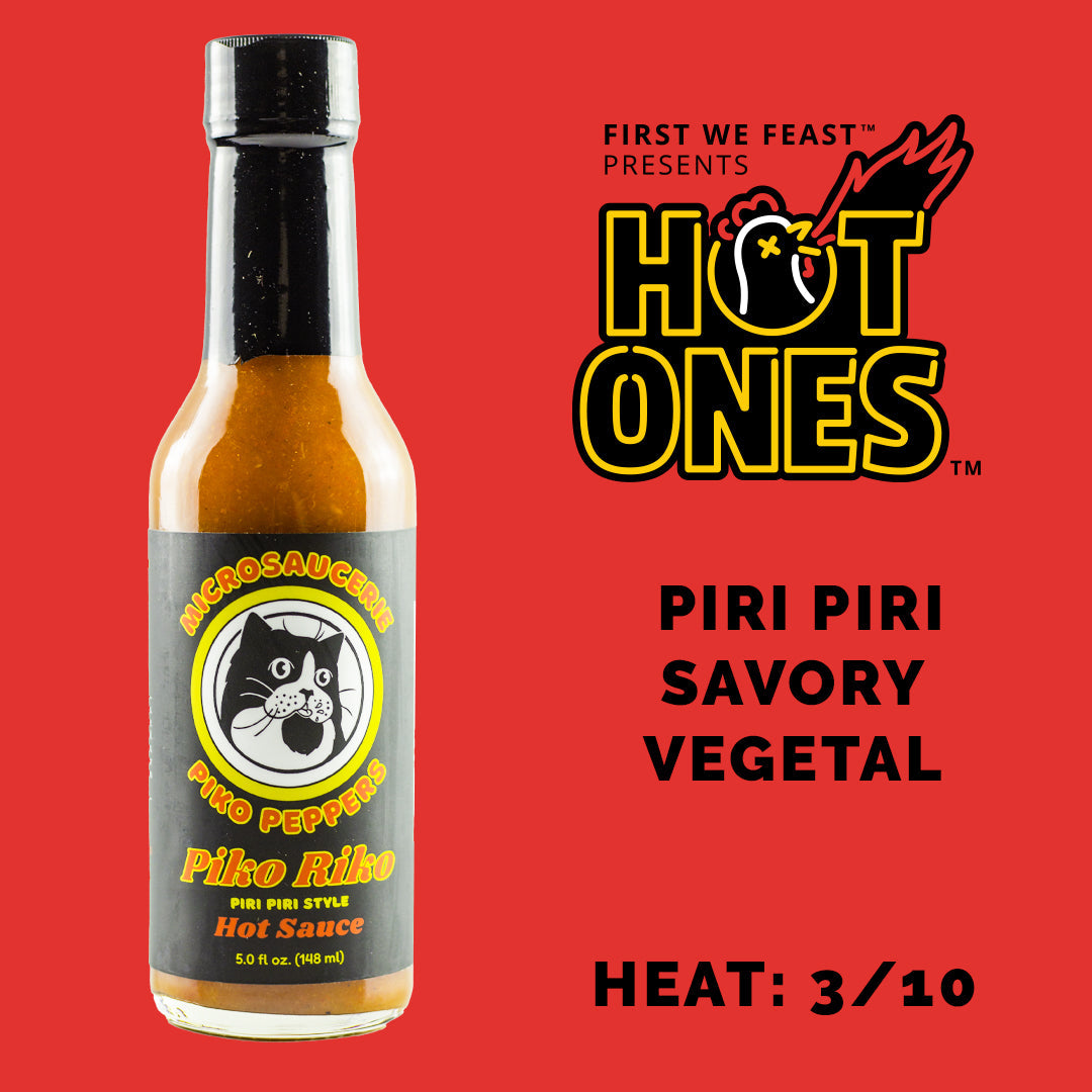 Newcomers to the Hot Ones lineup, Montreal-based Piko Peppers brings fresh flavor to the 3-spot with this tangy take on a Piri Piri sauce. Lots of savory and acidic notes usher in just-right heat - nbd yet, right?
