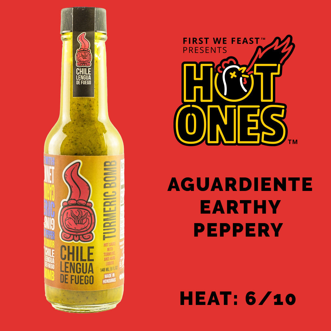 Hot Ones’ Honduran maker returns! This tangy turmeric hot sauce features Caribbean ingredients like Scotch Bonnet and a Honduran spirit called Aguardiente, which adds subtle sweetness that lingers with the chocolate ghost pepper heat.