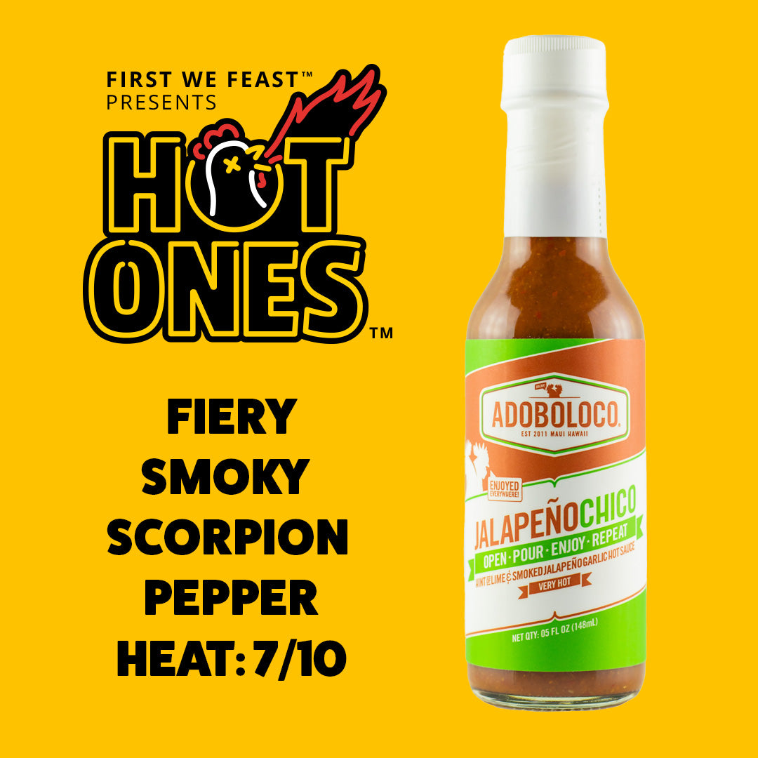 Here we have a return of Hot Ones hot sauce lineup royalty Adoboloco. That one's hot sauce lineup royalty, Hawaiian hot sauce royalty, Adoboloco Jalapeno Chico. I've eaten a lot of Adoboloco sauces in my life. This one right here by far the hottest super-smoky jalapeno and Scorpion pepper blend. Not to be messed with!